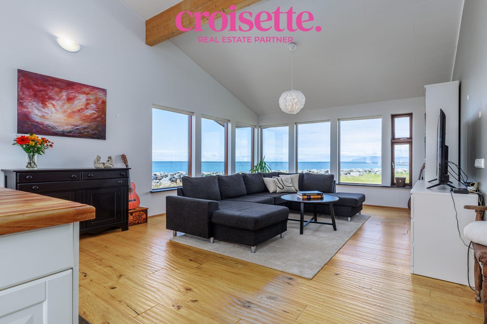 Stofa: Opin og björt stofa með fallegu sjávarútsýni til norðurs og vesturs. Góð lofthæð gerir rýmis mjög bjart og fallegt. Parket á gólfi.
