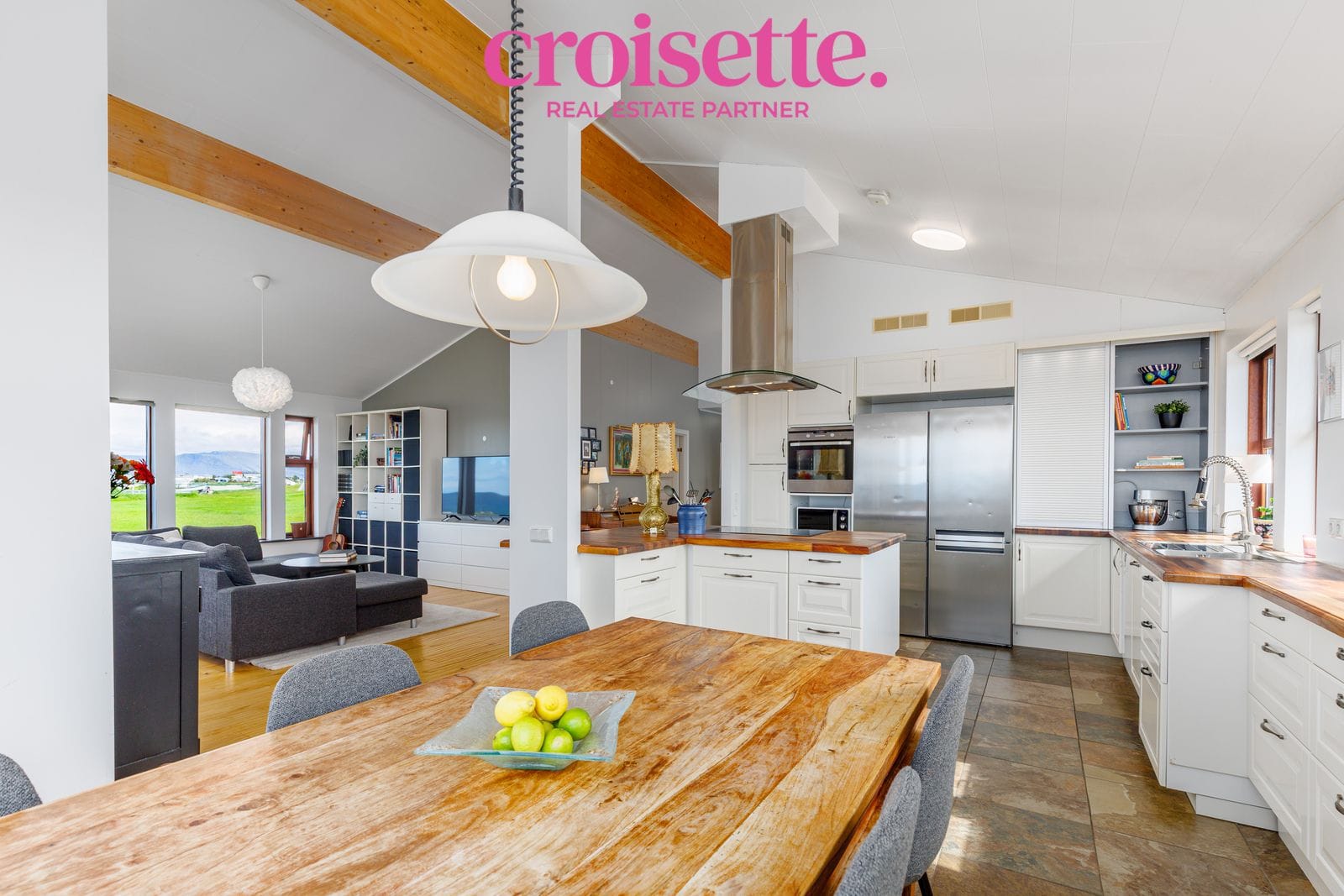 Eldhús: Stórt og opið eldhús með hvítri innréttingu með mjög miklu skápaplássi og plássi fyrir tvöfaldan ísskáp. Eyja með spanhellu og gufugleypi. Gegnheill viður í borðplötum í eldhúsi. Útgengt út í vesturgarðinn. Flísar á gólfi.