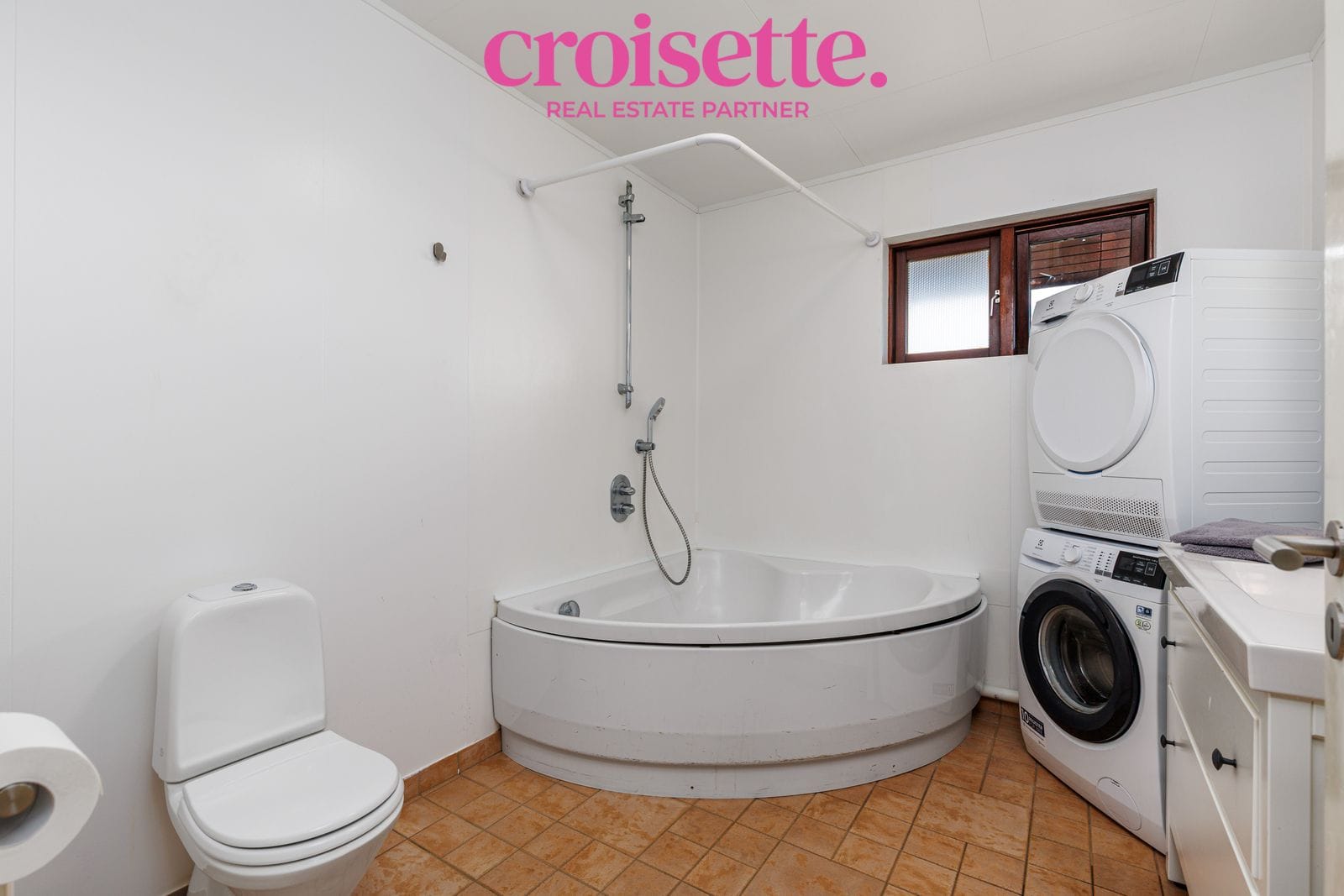Baðherbergi: Hornbaðkar, salerni, tengi fyrir þvottavél og þurrkara, salerni, vaskur á innréttingu. Flísar á gólfi.