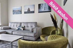 Stofa: Rúmgóð stofa með parketi á gólfi.