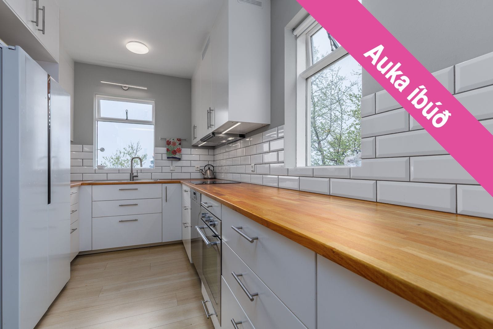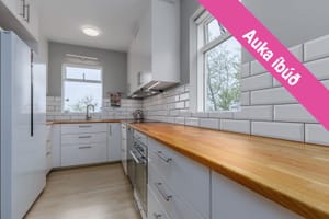 Eldhús: Hvít IKEA innrétting með viðarborðplötu, hvítum flísum á milli skápa, gott skápapláss, pláss fyrir tvöfaldan ísskáp. Harðparket á gólfi.